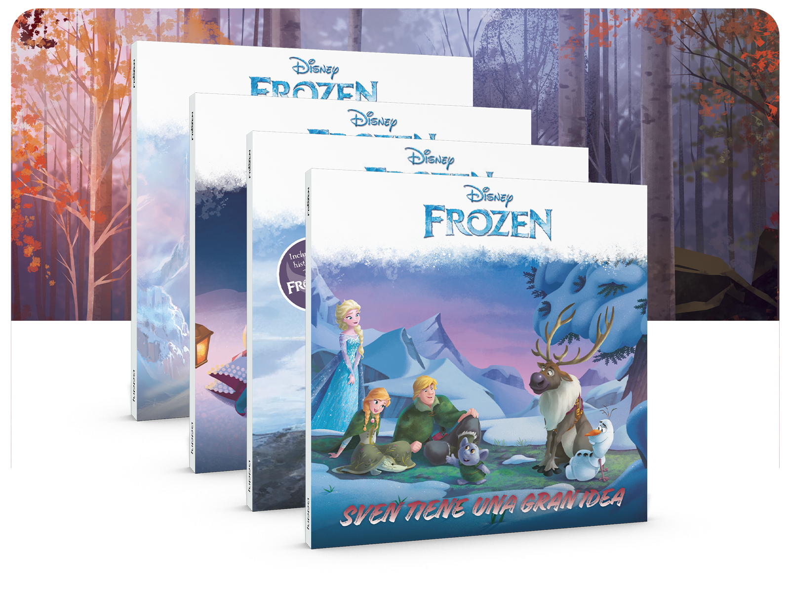 Titles: Elsa y el llamado de la naturaleza, Anna quiere saber, La navidad de Olaf, Una nueva aventura con Kristoff, Sven tiene una gran idea, Elsa la reina de la nieve, Encuentro en el mar oscuro, Anna y el festival de fin del invierno, Anna, Elsa y los gigantes de la tierra, Honeymaren y los espíritus de la naturaleza, Una Salamandra en el bosque encantado y el mensaje de Mattias. El regreso a casa.